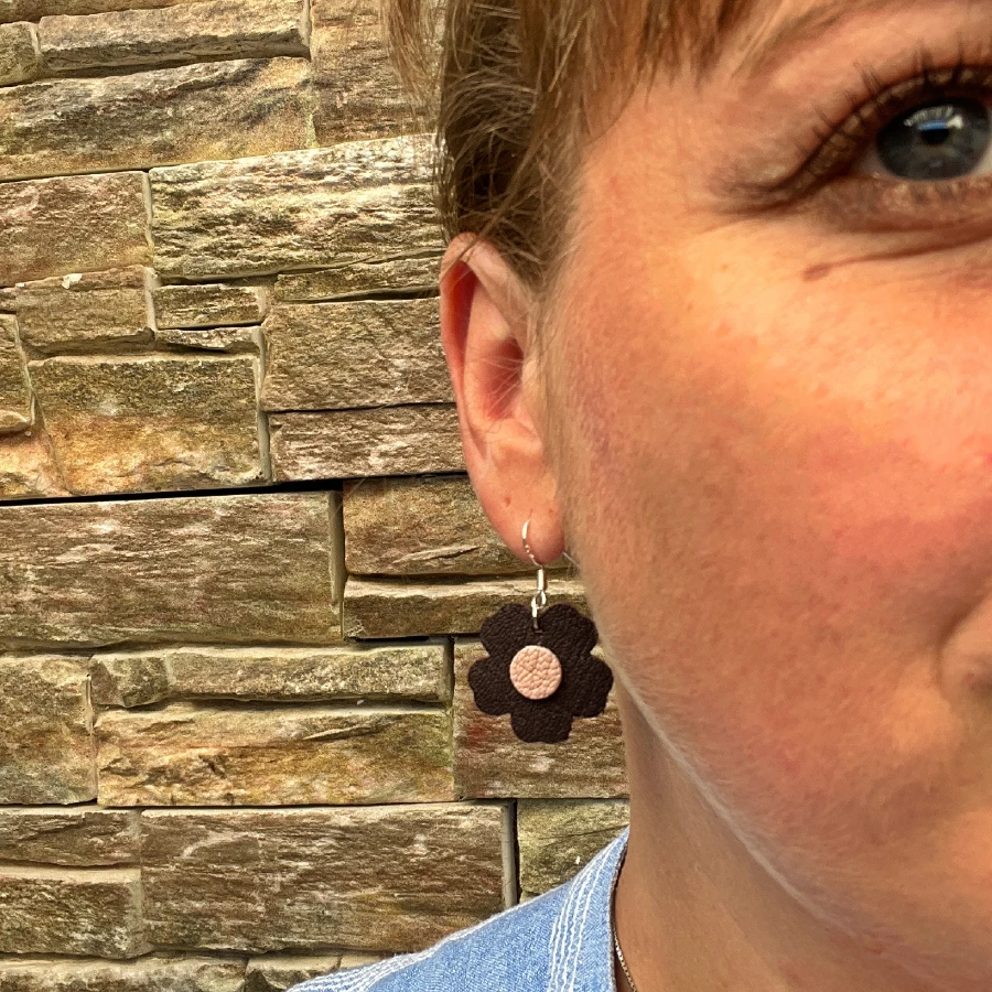 Boucles d’oreilles fleur en cuir chocolat et nude avec une monture en Argent 925/1000.