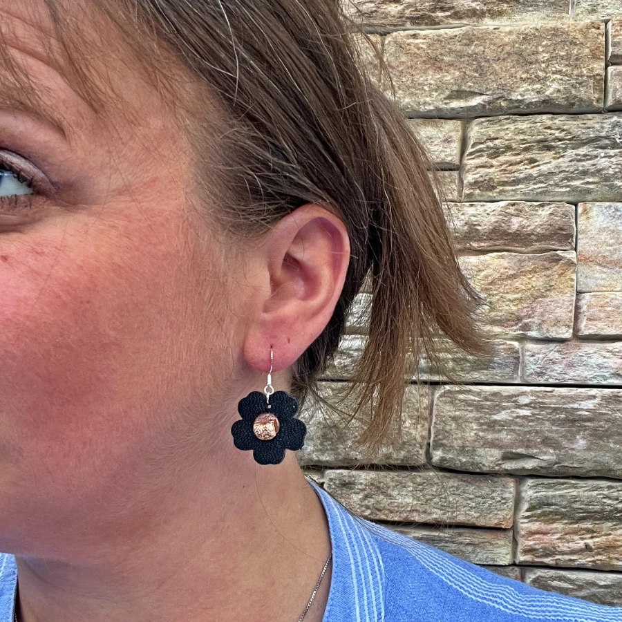 Boucles d’Oreilles Fleur en Cuir – Noir & Rose gold
