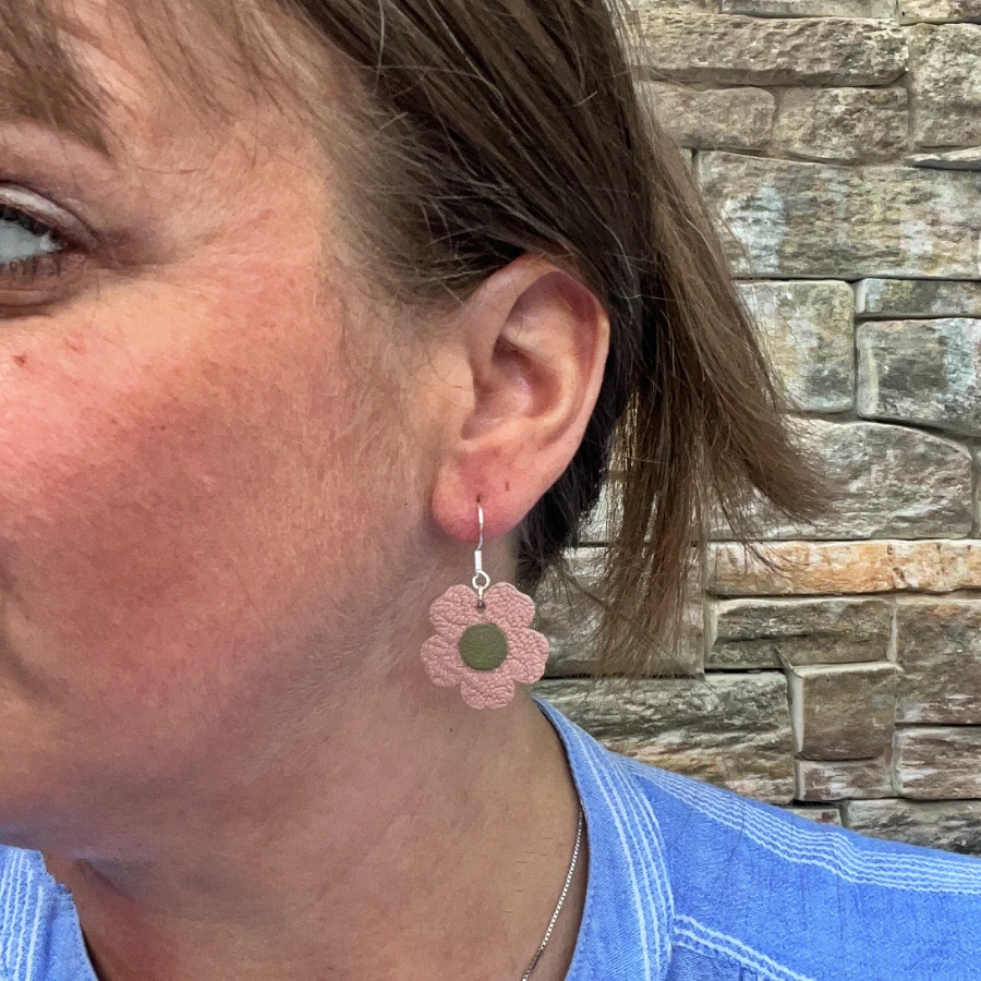Apportez une touche de douceur et d’originalité à votre look avec ces boucles d’oreilles fleur en cuir réalisées à la main dans mon atelier des Pyrénées-Orientales.