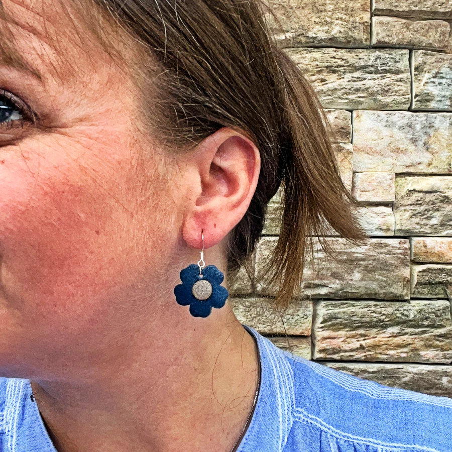 Apportez une touche de douceur et d’originalité à votre look avec ces boucles d’oreilles fleur en cuir et argent réalisées à la main dans mon atelier des Pyrénées-Orientales.