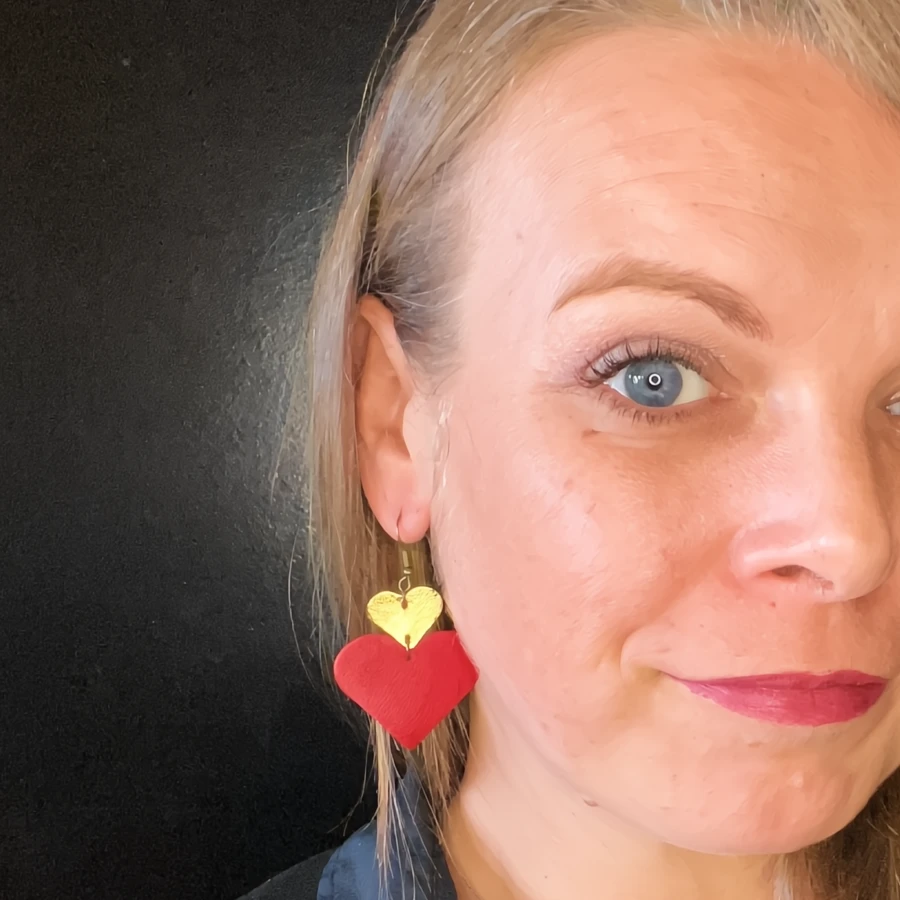 - Matériaux : Cuir de chèvre lisse rouge satiné et cuir d’agneau doré métallisé