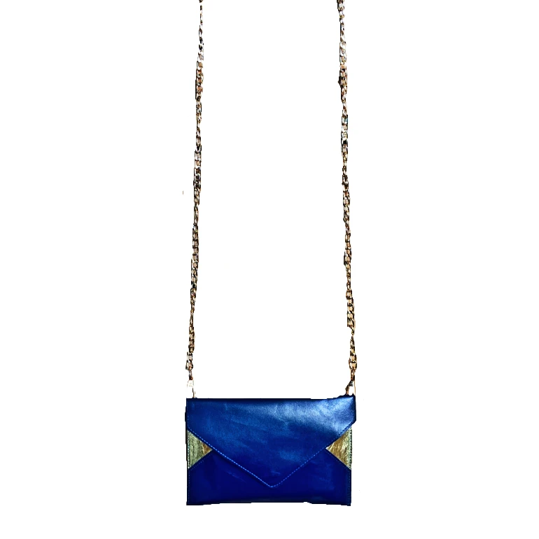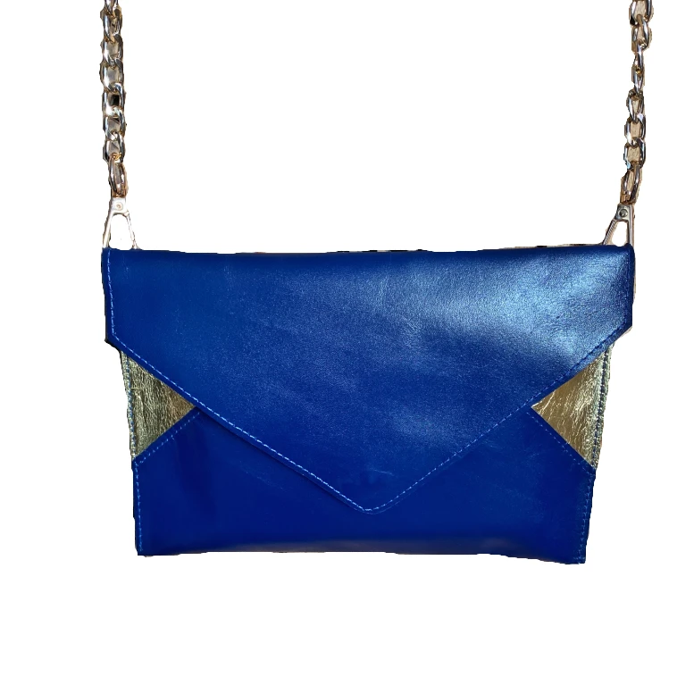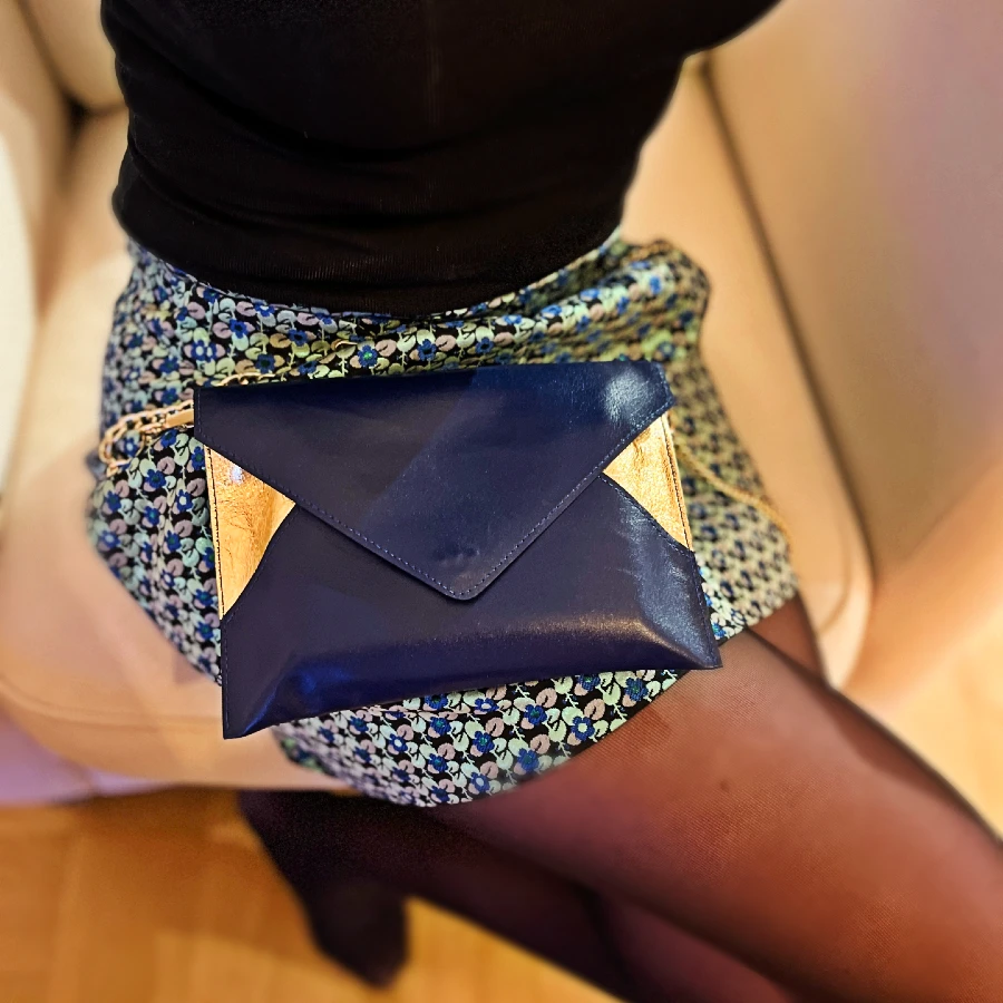 - Matériaux extérieur : Cuir de chèvre bleu navy lisse satiné et cuir d’agneau doré métallisé