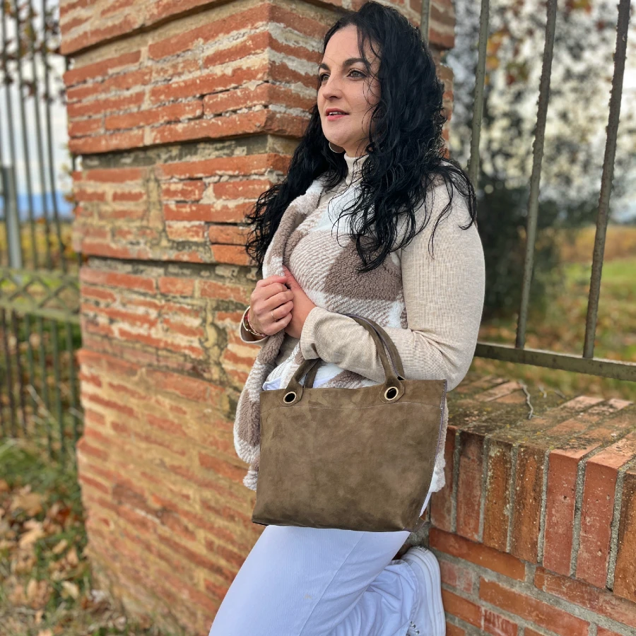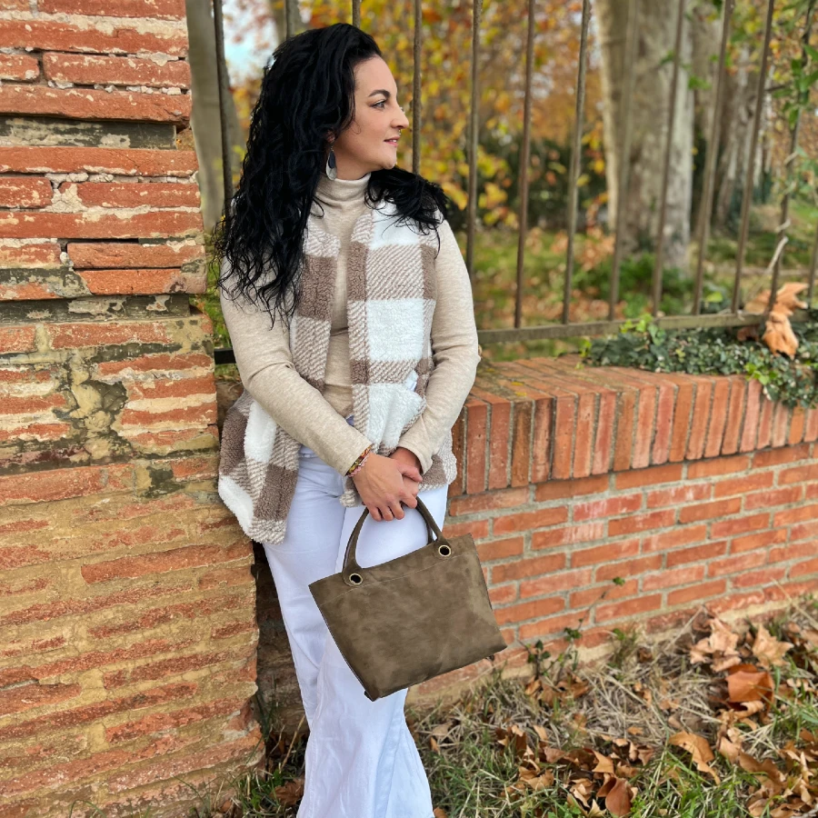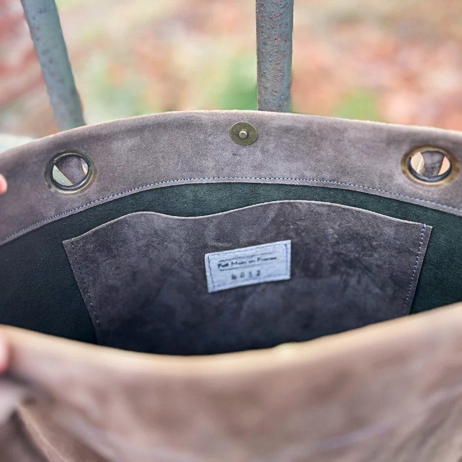 Sac « Camélia » petit modèle fabriqué à la main en cuir de chèvre nubuck marron doublé d’une microfibre Alcantara couleur vert kaki