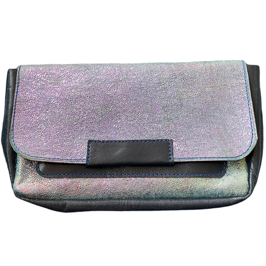 Pochette de soirée « Rita » porté main fabriquée en cuir de chèvre bleu nacré et cuir d’agneau bleu marine doublée d’une microfibre Alcantara bleue foncée agrémentée d’un fermoir bouton pression