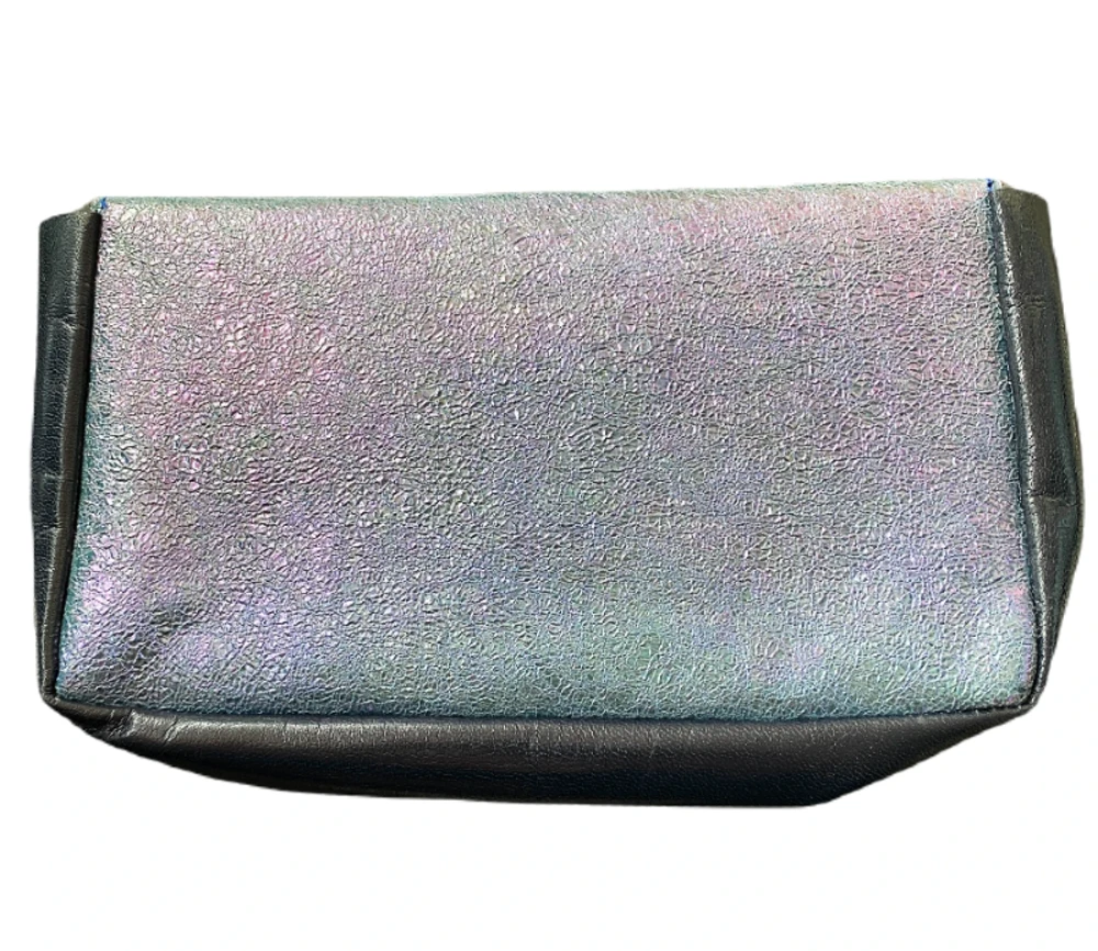 Pochette « Rita » en cuir de chèvre bleu nacré et cuir d’agneau bleu marine