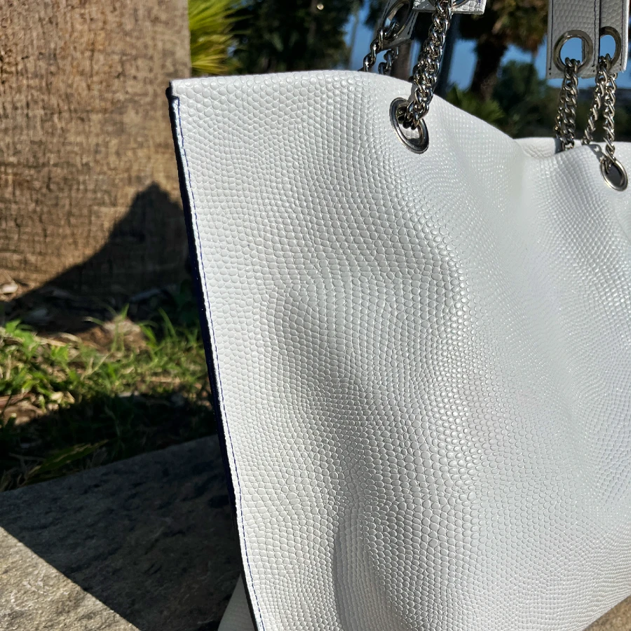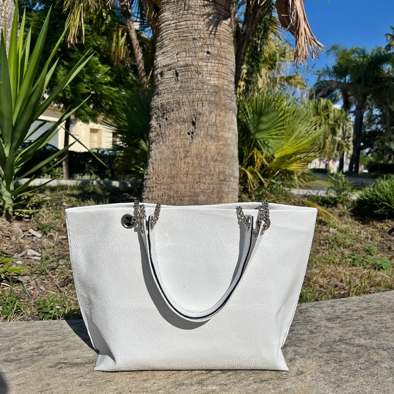 - Anses : Longueur 52 cm (porté épaule), largeur 3,5 cm avec chaine en aluminium nickelé