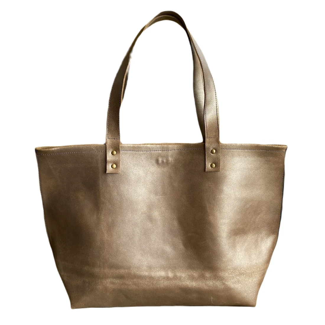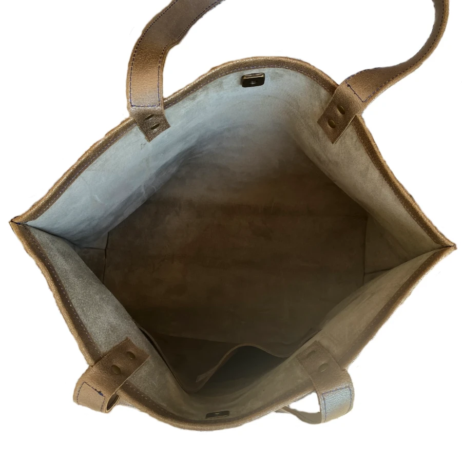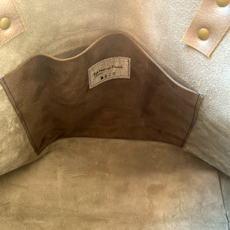 Sac cabas « Camélia » fabriqué à la main en cuir de de veau métallisé nacré doré doublé d’un cuir de porc velours beige agrémenté d’un fermoir bouton pression