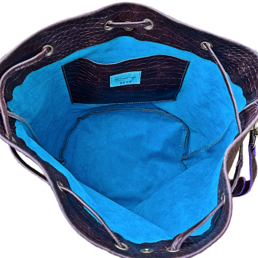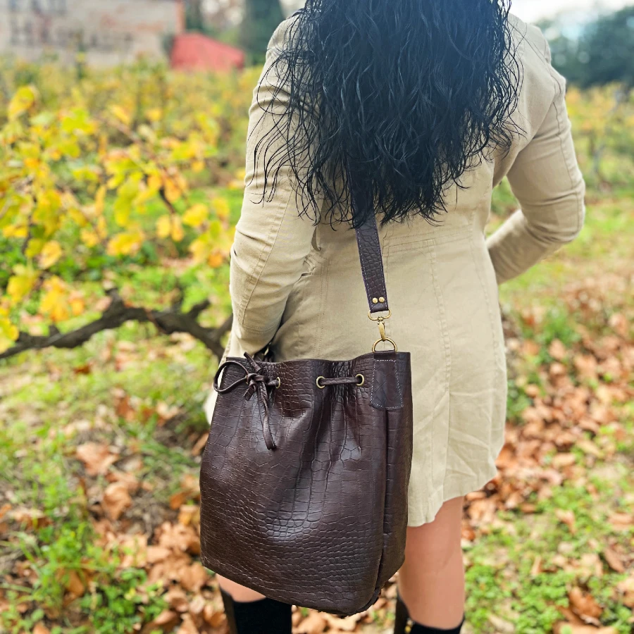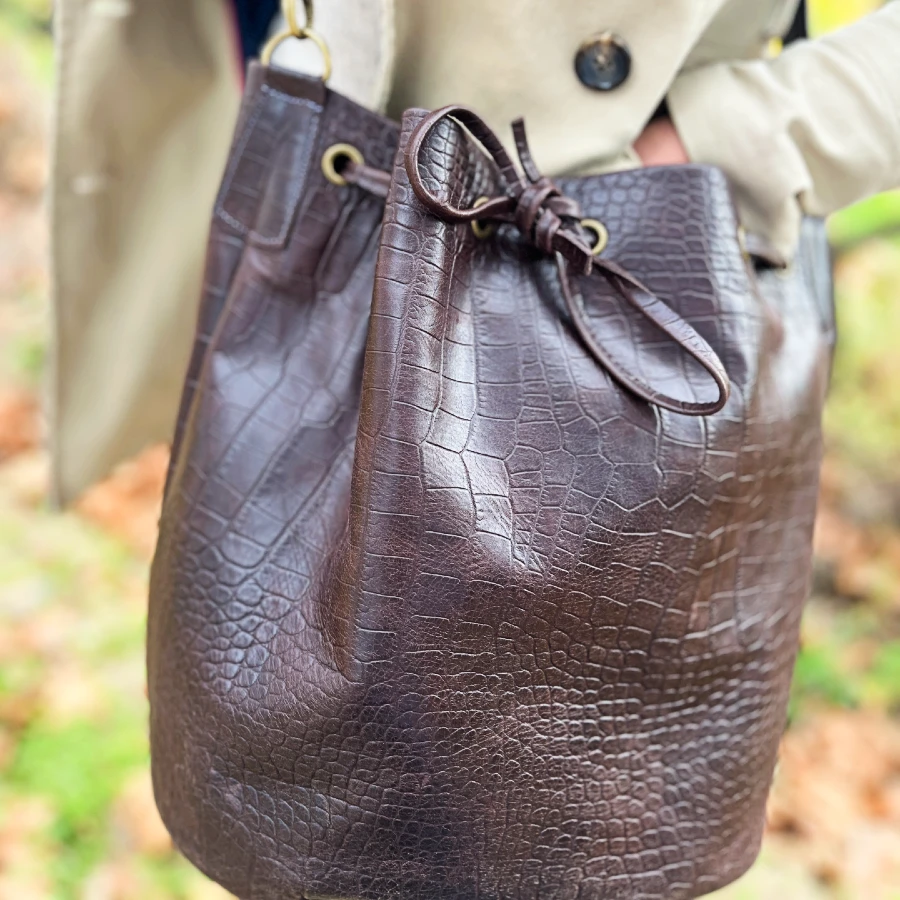 - Matériaux : Cuir de veau effet crocodile chocolat