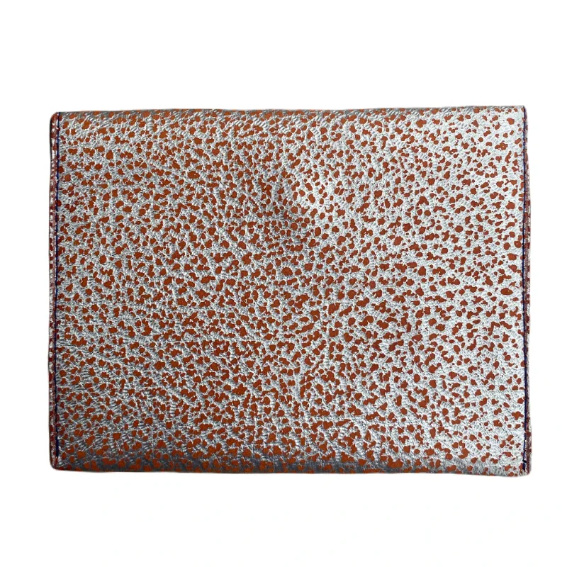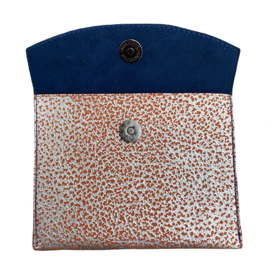 - Matériaux : Cuir d’agneau métallisé grainé couleur orange/argenté et doublure microfibre alcantara bleue, fermoir pression métal noir