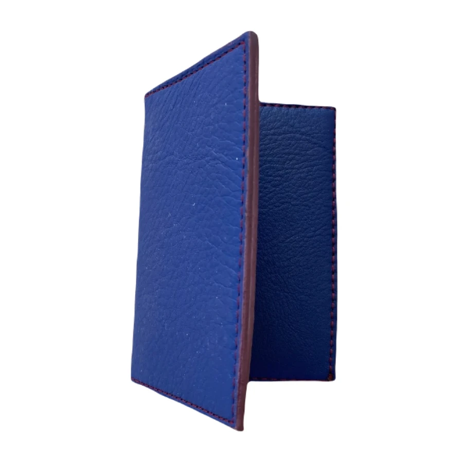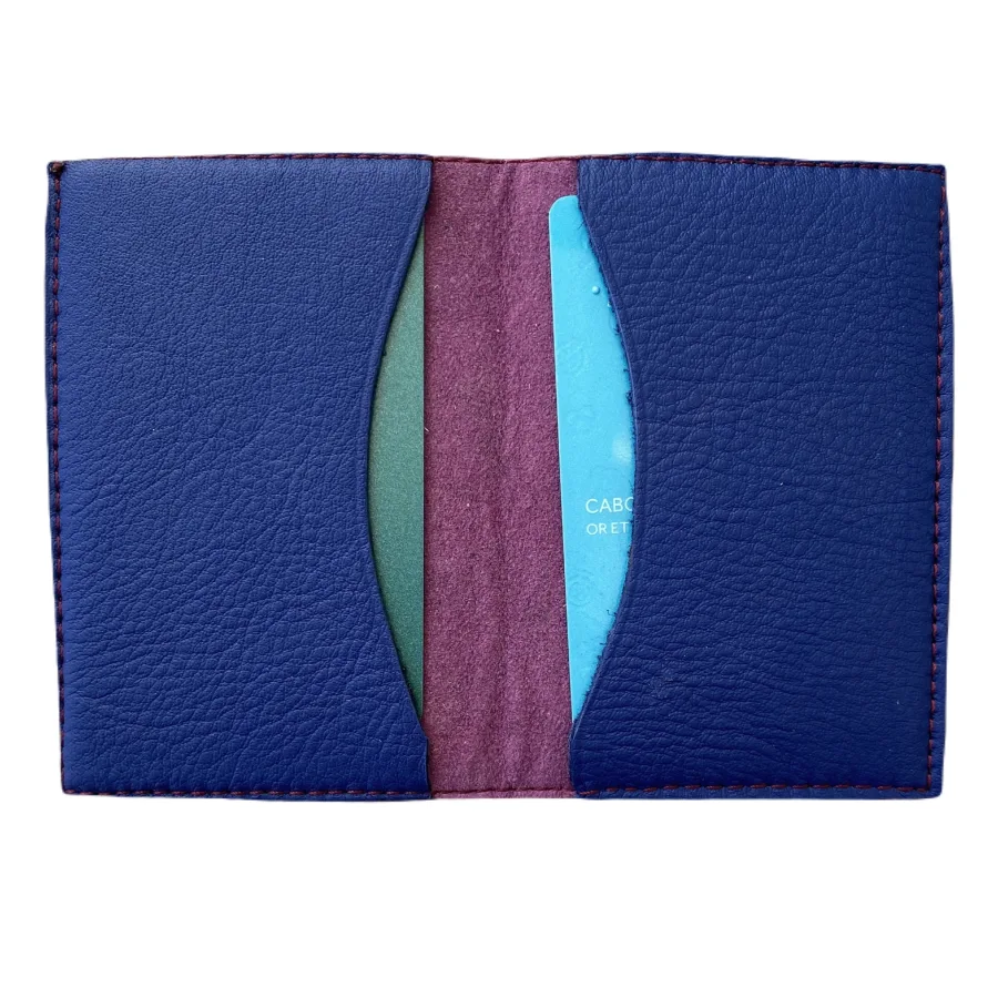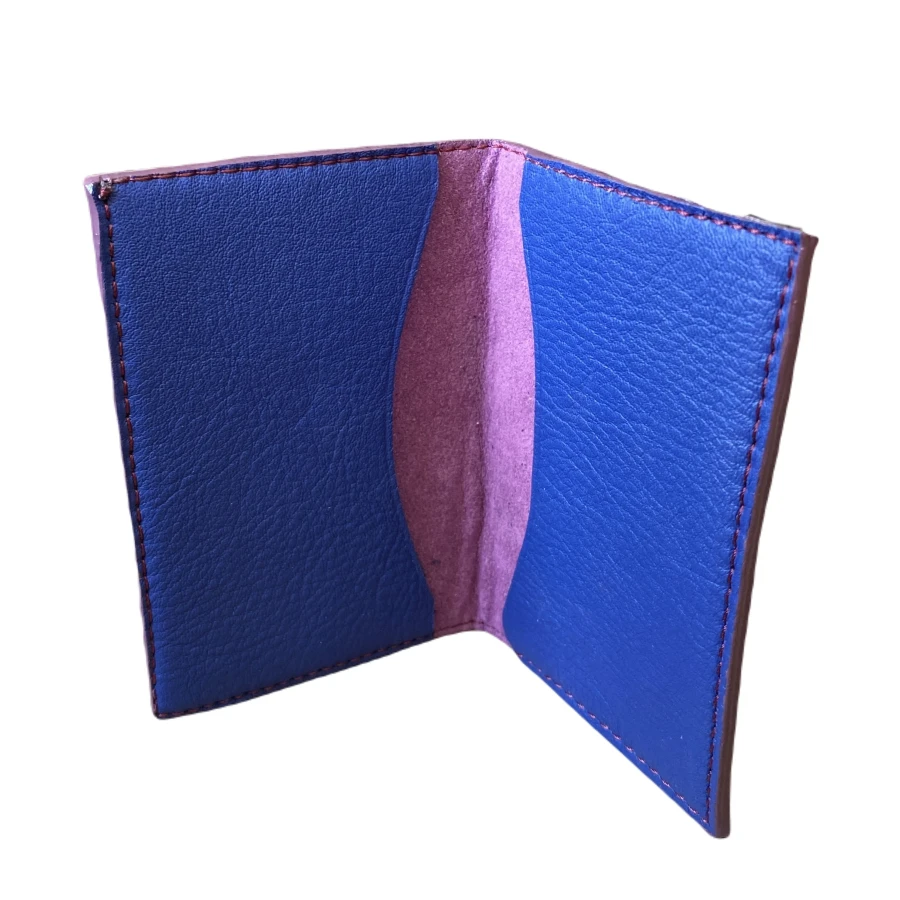 Porte-cartes fabriqué à la main en cuir de chèvre bleu foncé avec une doublure Alcantara lila