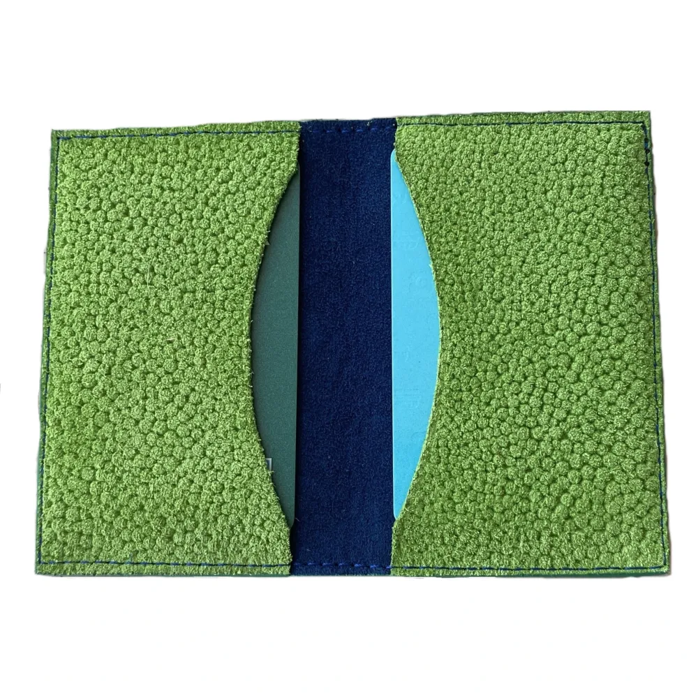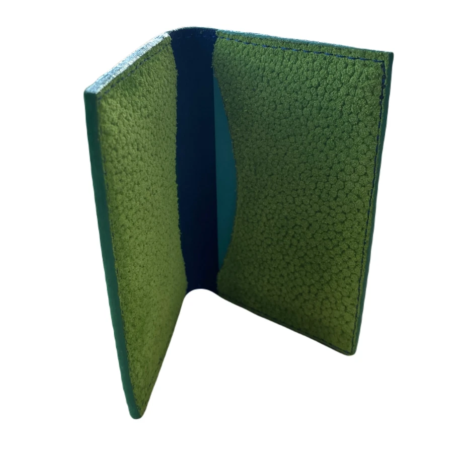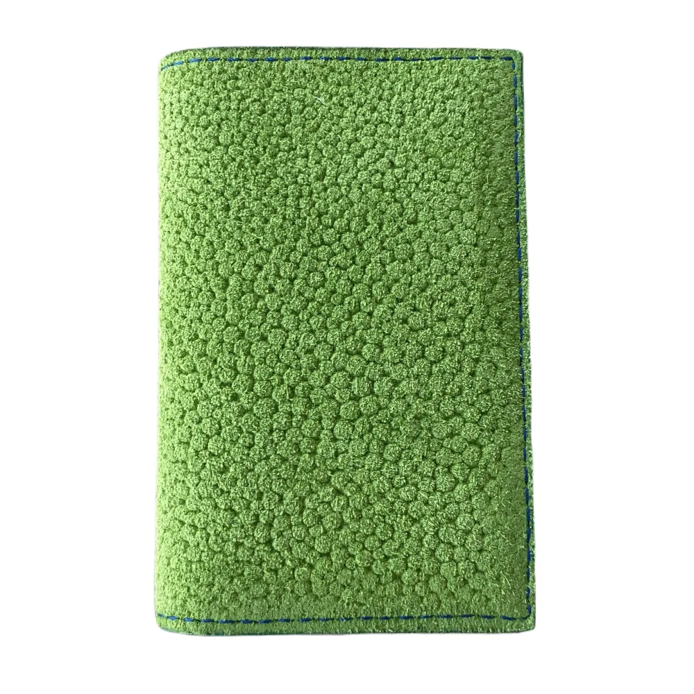 Porte-cartes fabriqué à la main en cuir de veau velours effet galuchat vert pomme avec une doublure Alcantara bleue foncé